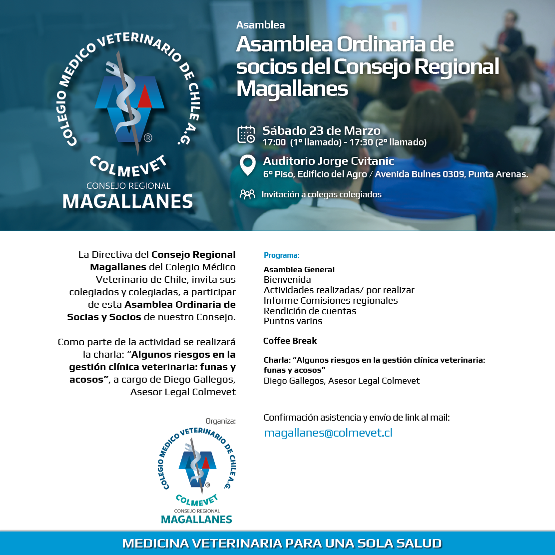 La Directiva del Consejo Regional Magallanes del Colegio Médico Veterinario de Chile, invita sus colegiados y colegiadas, a participar de esta Asamblea Ordinaria de Socias y Socios de nuestro Consejo. Esta asamblea se realizará el sábado 23 de marzo a las 17:00 (1° llamado) - 17:30 (2° llamado), en el Auditorio Jorge Cvitanic, 6° piso, Edificio del Agro, ubicado en Av. Bulnes 0309, Punta Arenas.