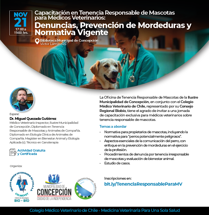 La Oficina de Tenencia Responsable de Mascotas de la Ilustre Municipalidad de Concepción, en conjunto con el Colegio Médico Veterinario de Chile, representado por su Consejo Regional Biobío, tiene el agrado de invitar a una jornada de capacitación exclusiva para médicos veterinarios sobre tenencia responsable de mascotas. La jornada se realizará el jueves 21 de noviembre de 17:00 a 19:00 hrs., en la Biblioteca Municipal de Concepción ubicada en Víctor Lamas 615. Actividad Gratuita y Certificada