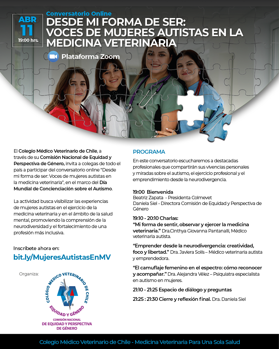 El Colegio Médico Veterinario de Chile, a través de su Comisión Nacional de Equidad y Perspectiva de Género, invita a colegas de todo el país a participar del conversatorio online “Desde mi forma de ser: voces de mujeres autistas en la Medicina Veterinaria”, en el marco del Día Mundial de Concienciación sobre el Autismo. La actividad busca visibilizar las experiencias de mujeres autistas en el ejercicio de la Medicina Veterinaria y en el ámbito de la salud mental, promoviendo la comprensión de la neurodiversidad y el fortalecimiento de una profesión más inclusiva.