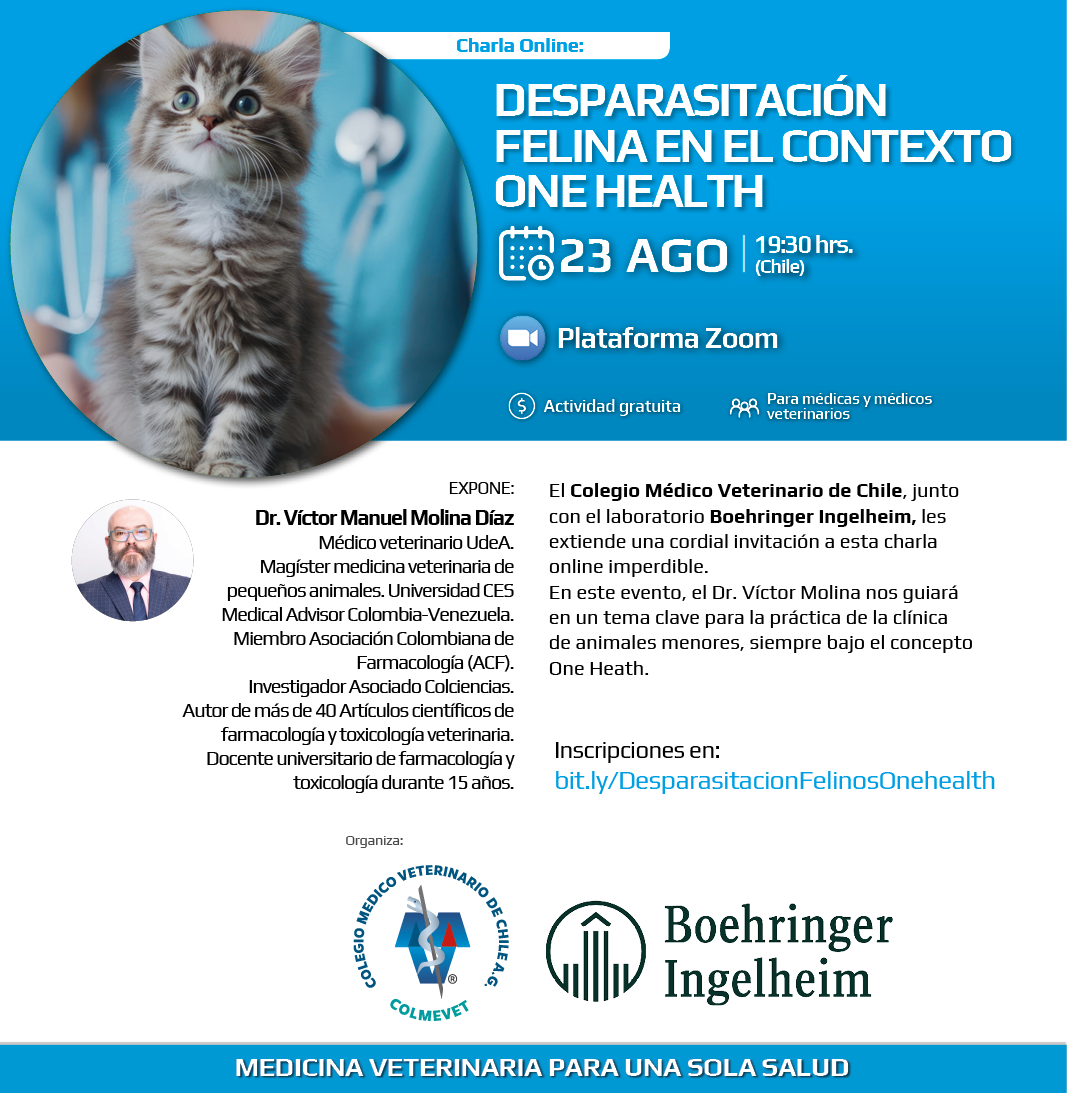 El Colegio Médico Veterinario de Chile, junto con el laboratorio Boehringer Ingelheim, les extiende una cordial invitación a esta charla online imperdible. Charla online gratuita, dirigida a médicas y médicos veterinarios.