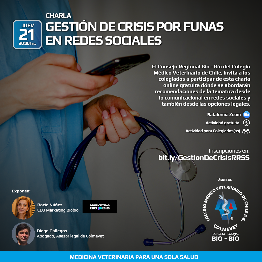El Consejo Regional Bio - Bío del Colegio Médico Veterinario de Chile, invita a los colegiados a participar de esta charla online gratuita dónde se abordarán recomendaciones de la temática desde lo comunicacional en redes sociales y también desde las opciones legales. Charla Online a realizarse el jueves 21 de marzo a las 20:00 hrs.