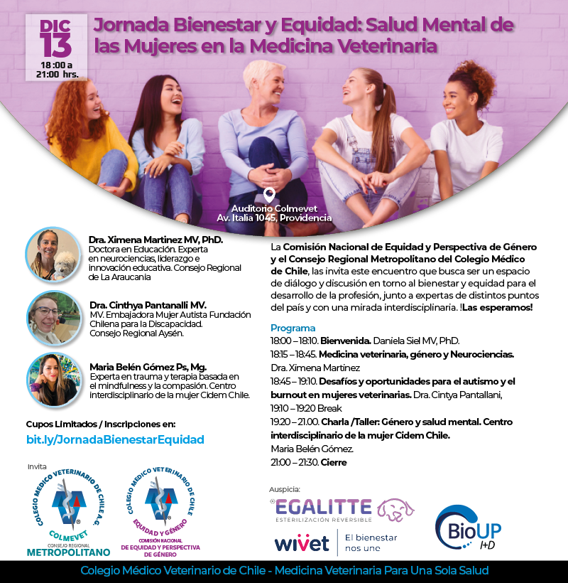 La Comisión Nacional de Equidad y Perspectiva de Género y el Consejo Regional Metropolitano del Colegio Médico Veterinario de Chile, las invita este encuentro que busca ser un espacio de diálogo y discusión en torno al bienestar y equidad para el desarrollo de la profesión, junto a expertas de distintos puntos del país y con una mirada interdisciplinaria. Las esperamos este viernes 13 de diciembre desde las 18:30 hrs. en el Auditorio de la sede nacional de Colmevet, unicado en Av. Itala 1045, Providencia.