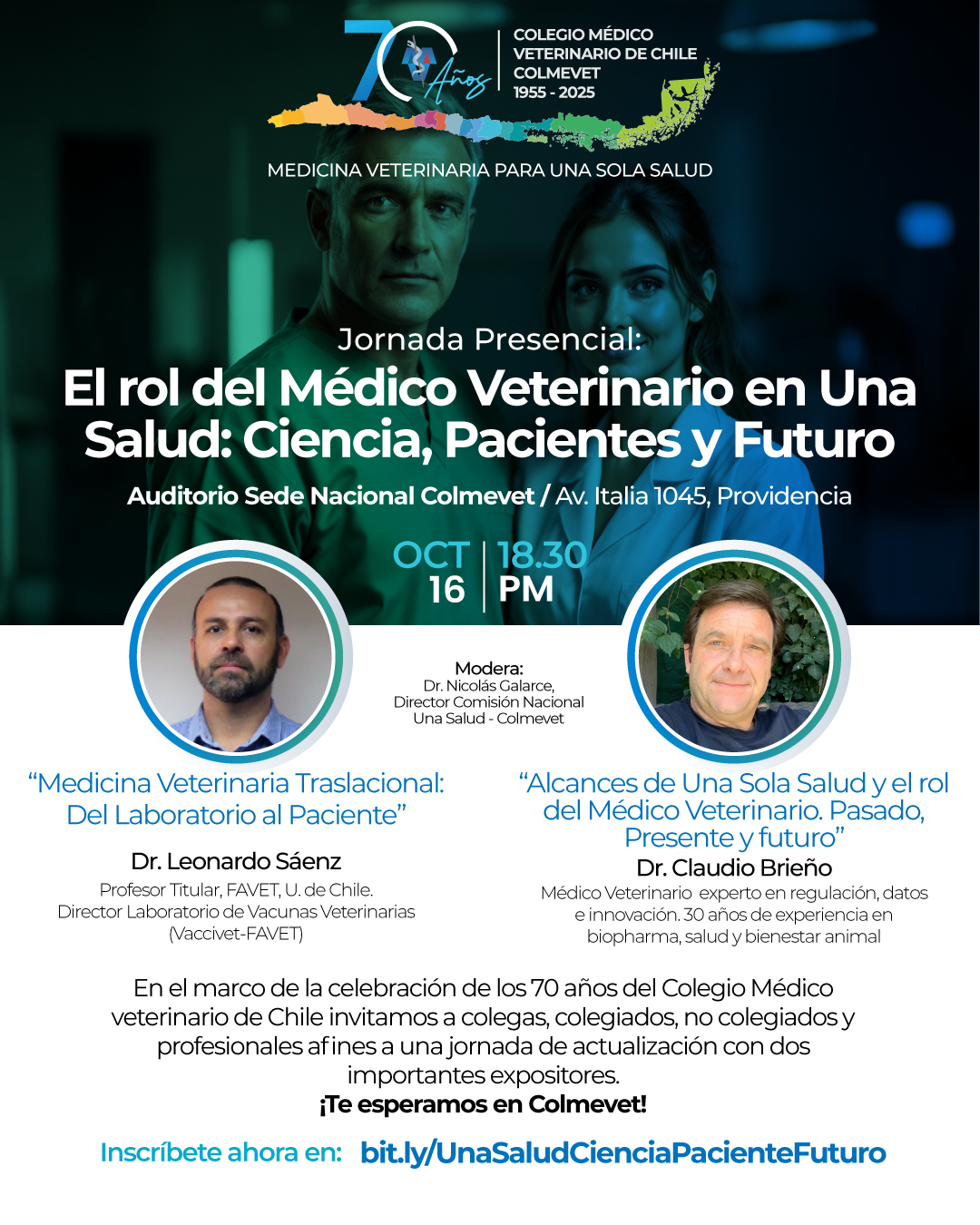En el marco de la celebración de los 70 años del Colegio Médico veterinario de Chile invitamos a colegas, colegiados, no colegiados y profesionales afines a una jornada de actualización con dos importantes expositores.